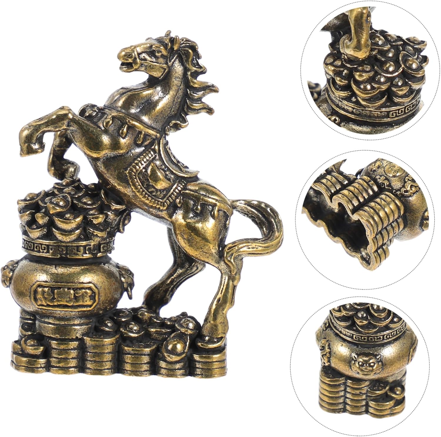 風水において馬は、前進・出世・成功・勝利などを象徴する動物とされ、金色の馬の彫刻は、金運・財運の向上、事業の発展、昇進など、様々な分野での開運効果が期待できます。まさに、富と成功を願う方にとって、非常に縁起の良いアイテムです。