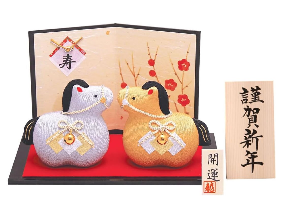 おめでたい新年の門出を一層華やかに演出する、金銀の馬(うま)の干支置物、お正月飾り、書家による手書きの「謹賀新年」のオリジナル木札つきです。