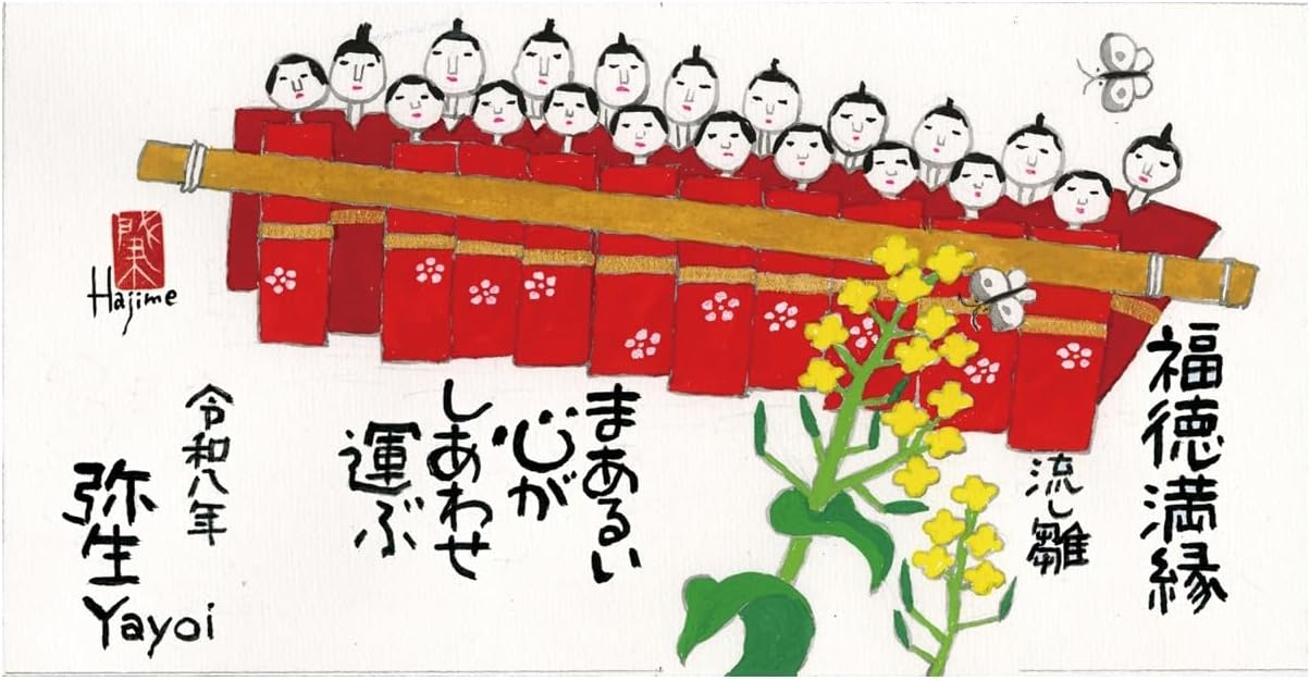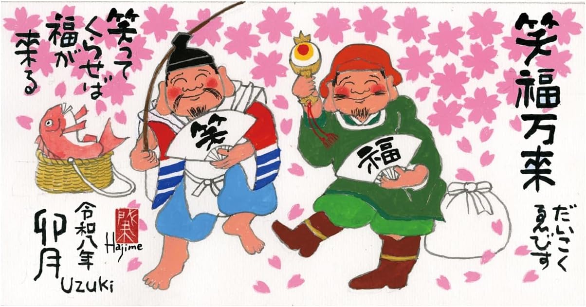 画かれているのは、2026年の干支午年の馬(うま)にちなんで、張り子の「親子馬」、招き猫・たぬき、七福神の大黒さん・恵比寿さん、ビリケンさん、瓢箪(ひょうたん)、達磨(だるま)、流し雛、福助さん、などなど。