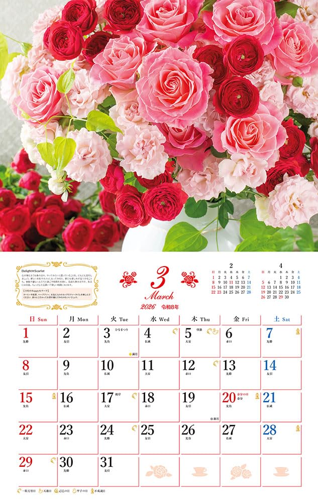 ユミリー風水で絶大な人気を誇る直居由美里氏が監修した美しいバラのカレンダーです。2026年のラッキーカラーと運勢から導き出した12ヶ月のHappy Roseが、あなたを幸運へと導きます。特別付録に卓上カレンダーとして使える大好評の「ミニカレンダー」が今年も付きます。季節のイベント、六曜、二十四節気、雑節、朔望、一粒万倍日、風水暦、前後月を掲載。